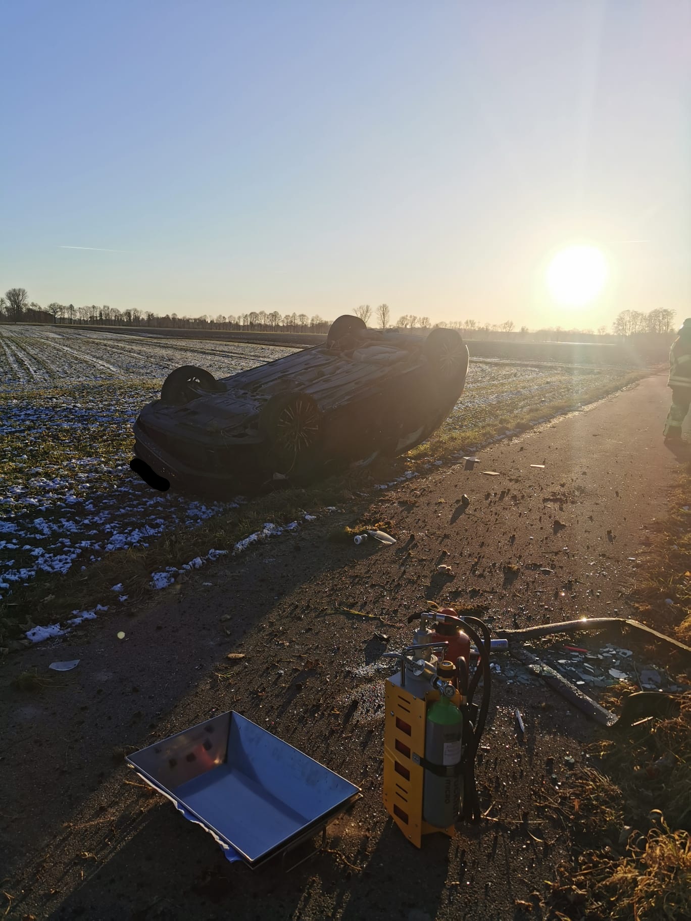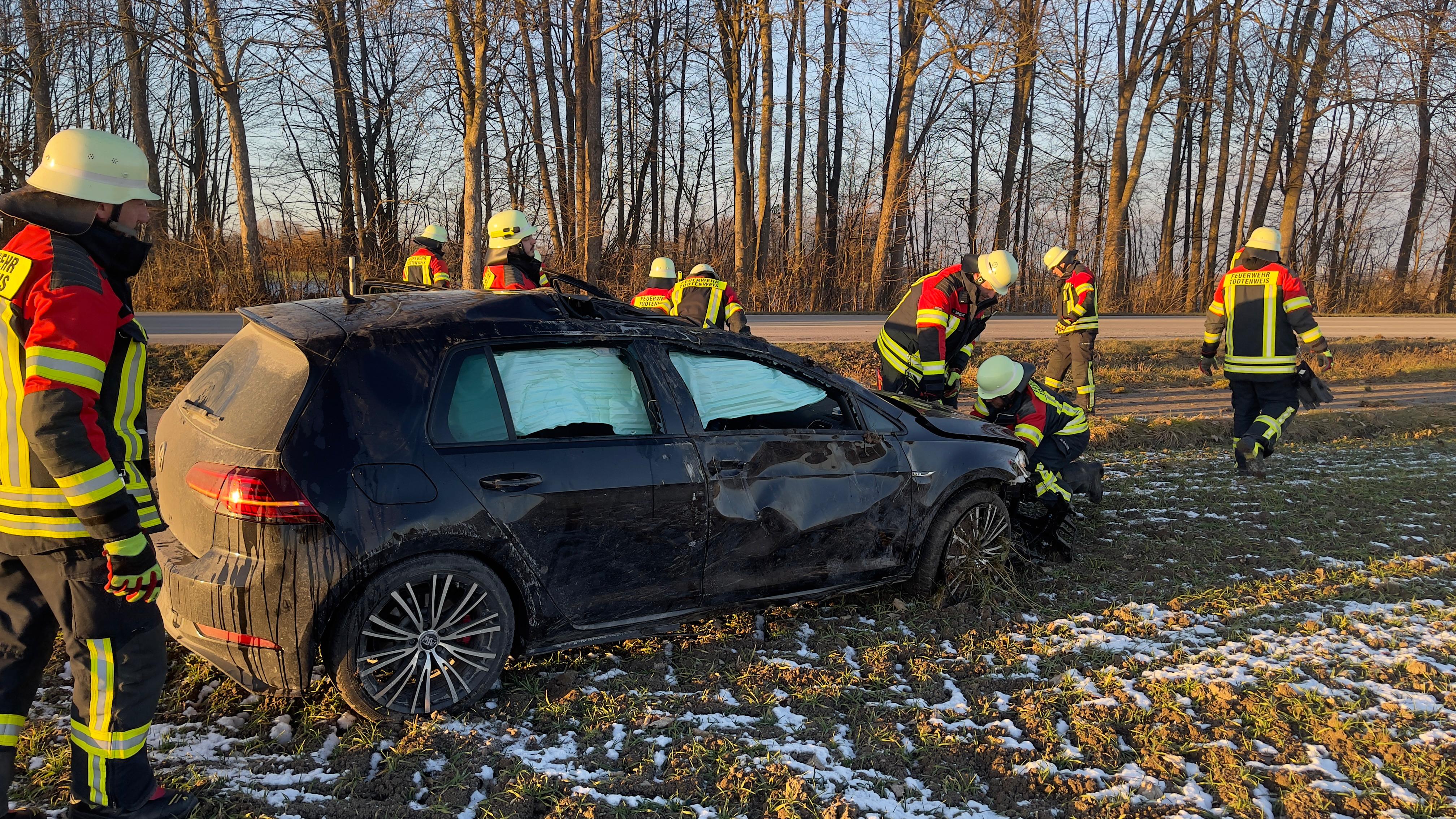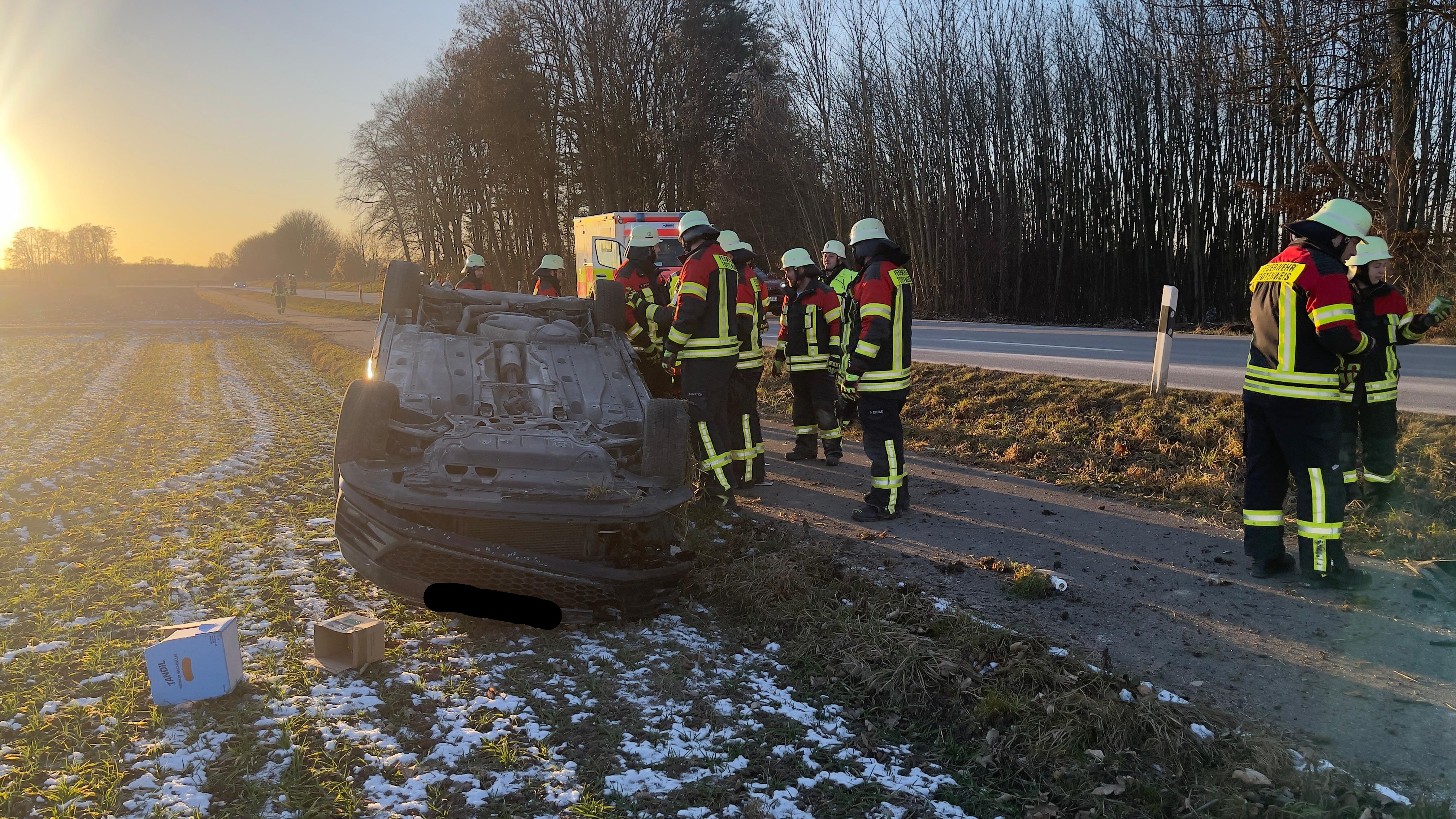 Ein Fahrzeug hatte sich dabei überschlagen und war auf dem Dach liegen geblieben. Die Fahrerin konnte sich glücklicherweise selbst aus dem Fahrzeug befreien. Beim Einteffen der Feuerwehr wurde sie bereits durch einen zufällig vorbei fahrenden Rettungswagen versorgt.