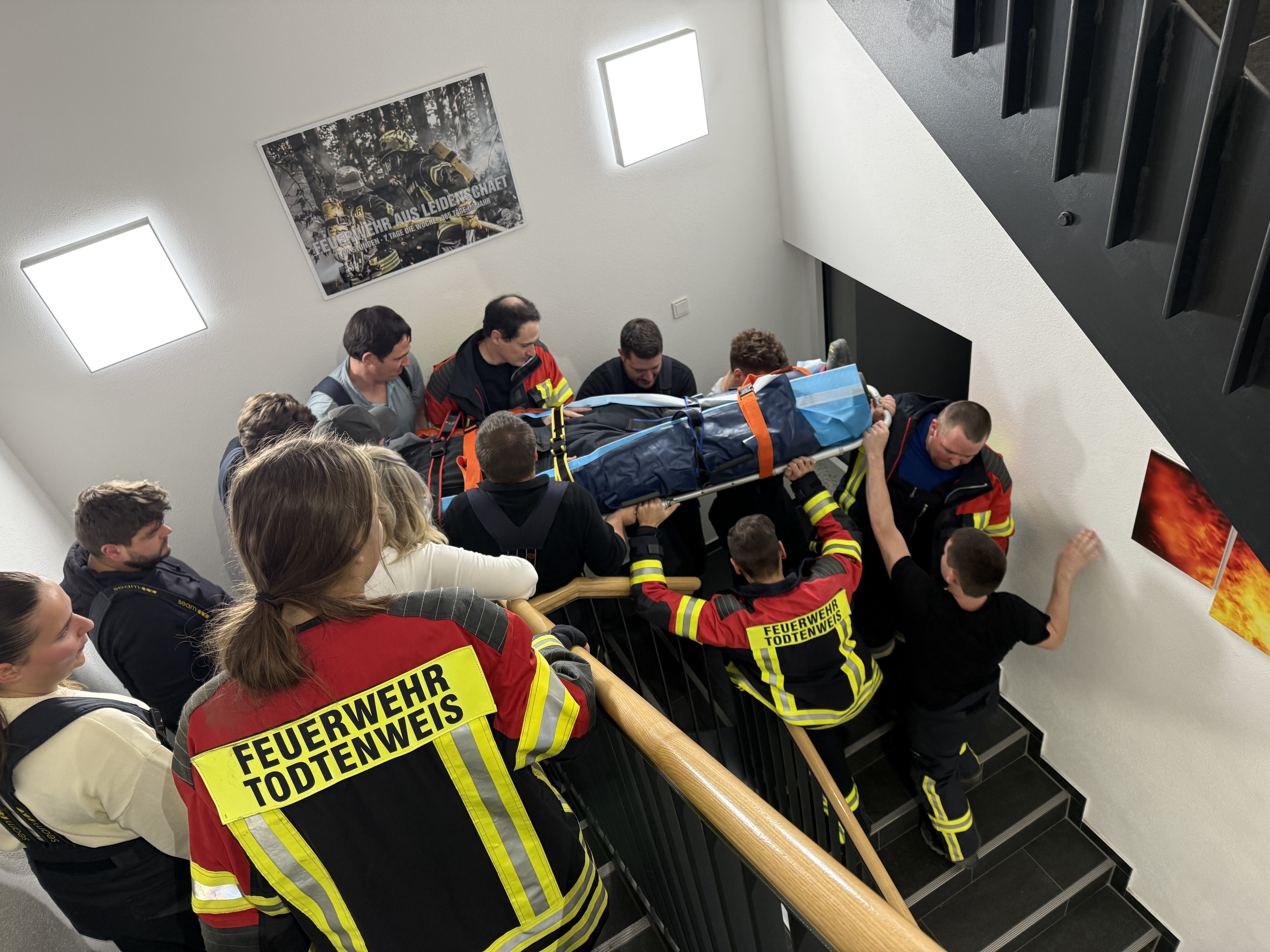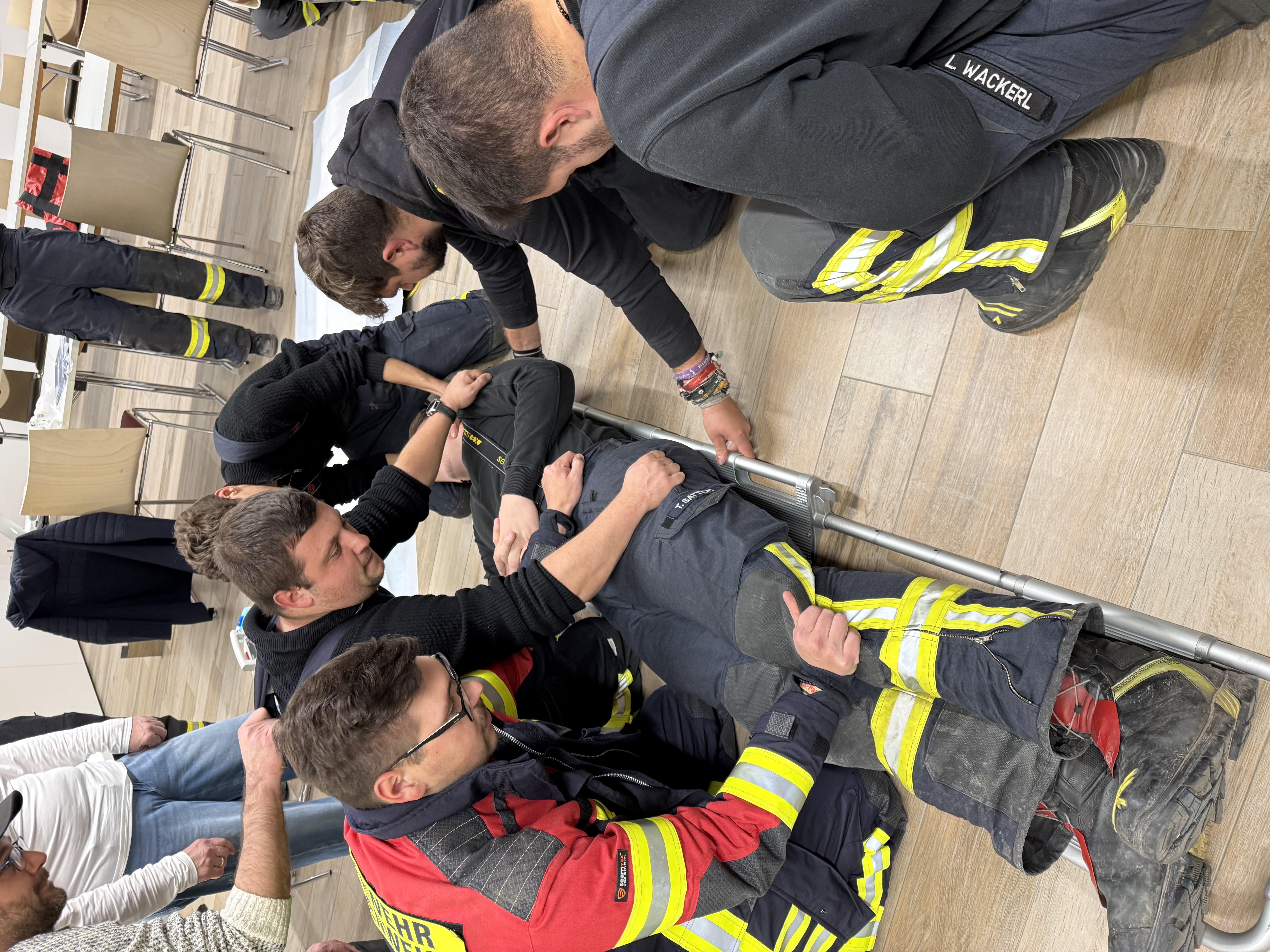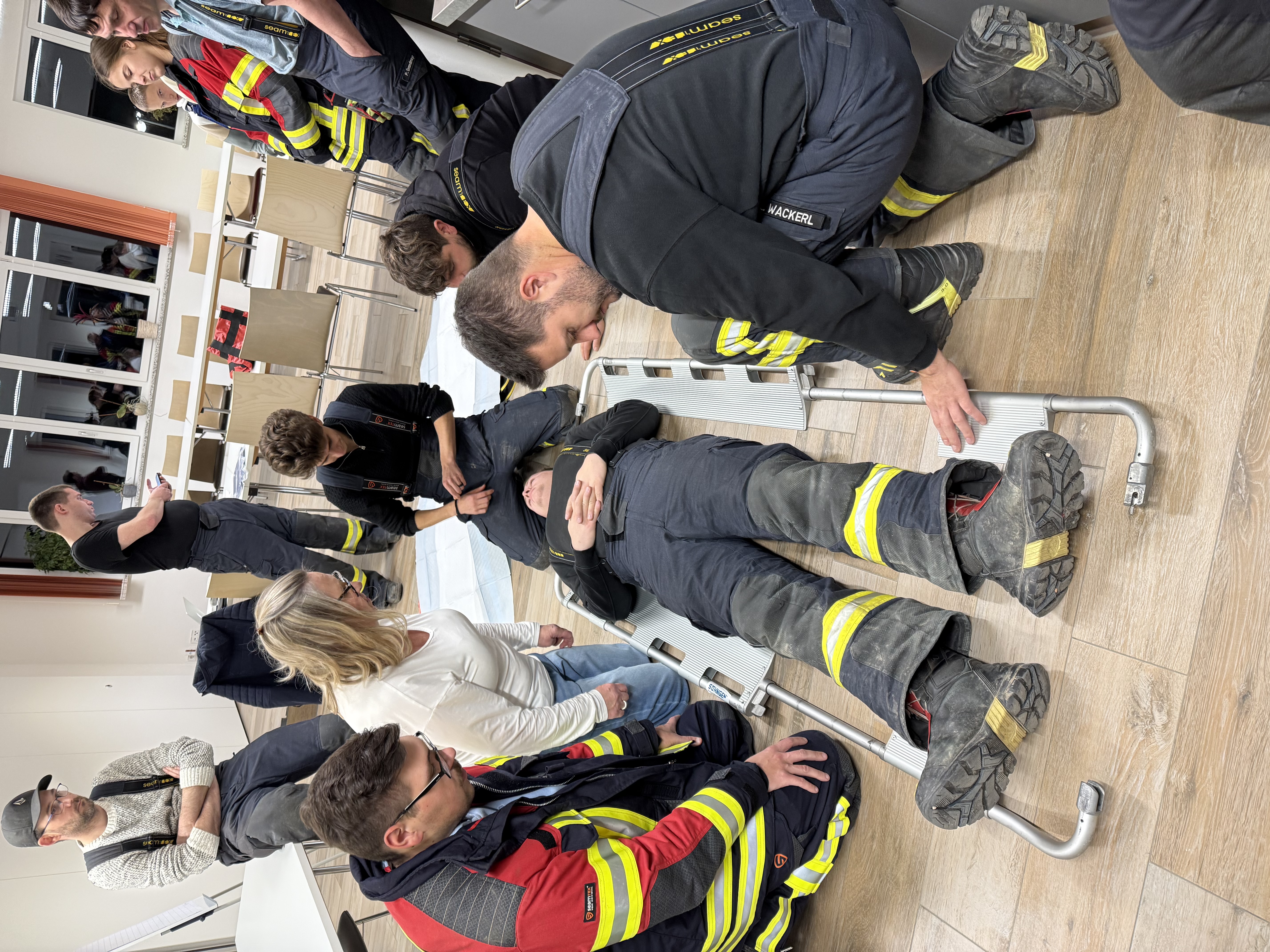 Im Anschluss an den theoretischen Teil wurde das Gelernte in einer praxisnahen Übung angewendet. Die Feuerwehrkräfte trainierten verschiedene Szenarien, wie sie im Einsatzalltag häufig vorkommen: das schonende Umlagern einer verletzten Person, das gemeinsame Tragen über enge Treppenhäuser sowie das sichere Arbeiten in unwegsamem Gelände. Dabei konnten alle Teilnehmenden wertvolle Erfahrungen sammeln und Routine in der Abstimmung mit dem Rettungsdienst entwickeln.