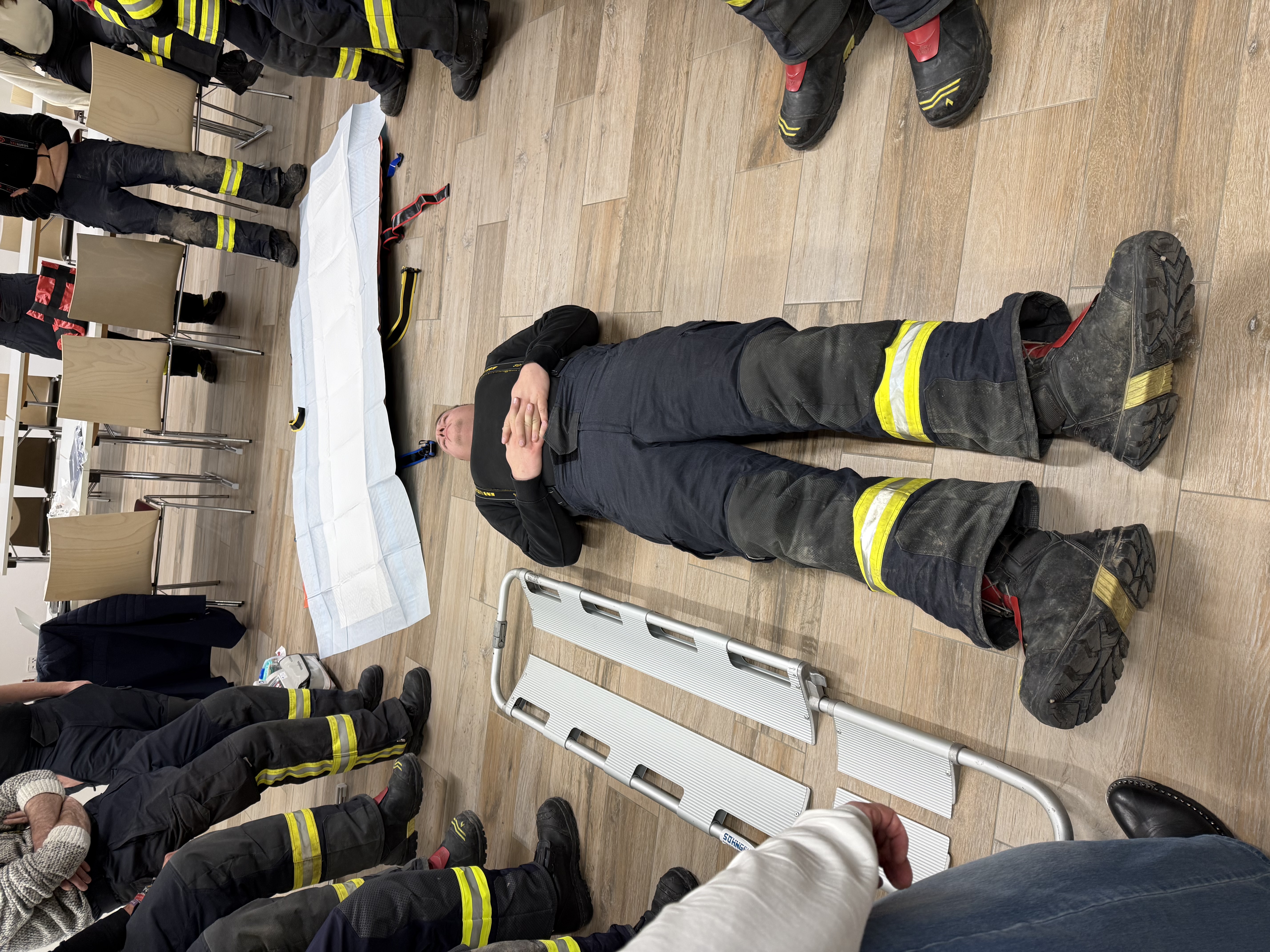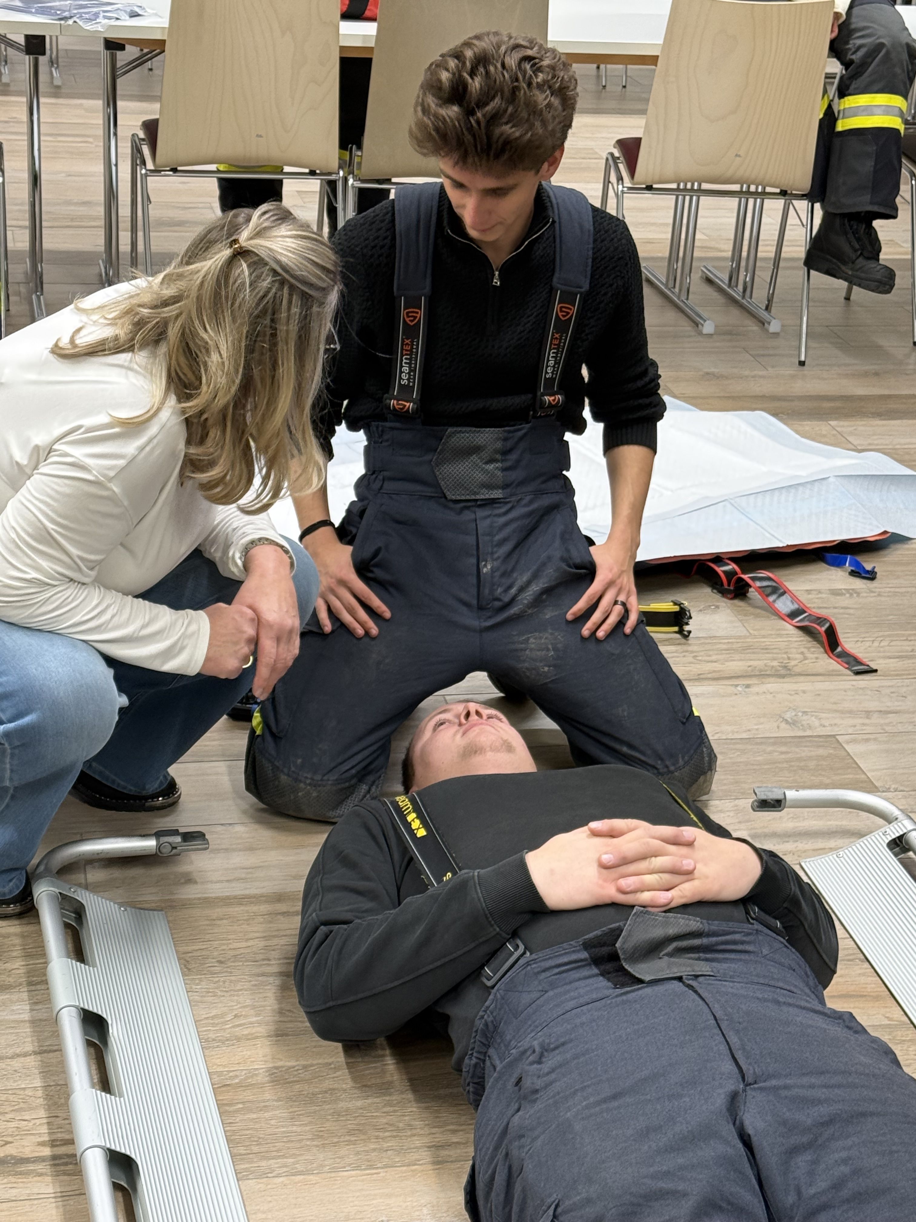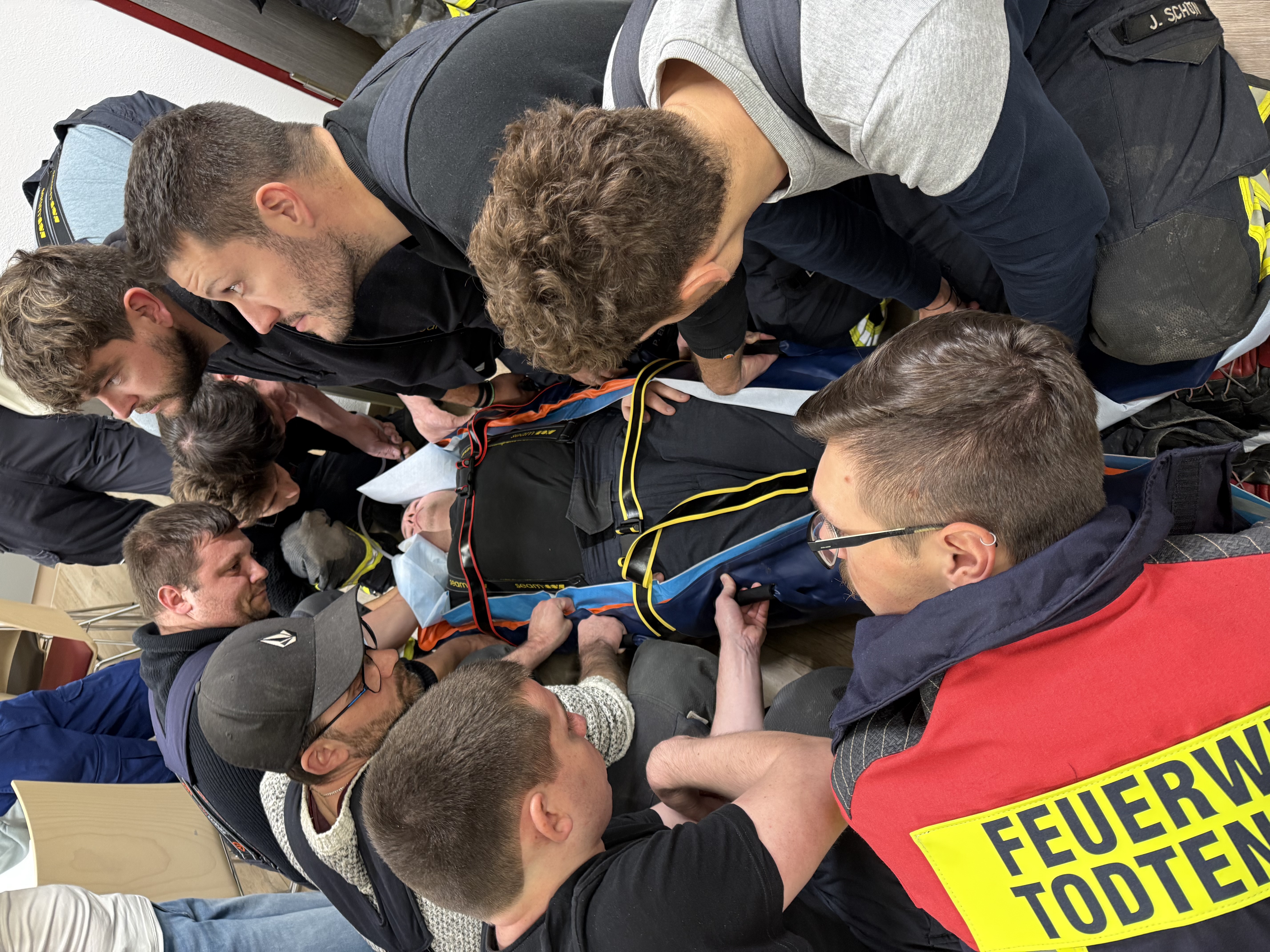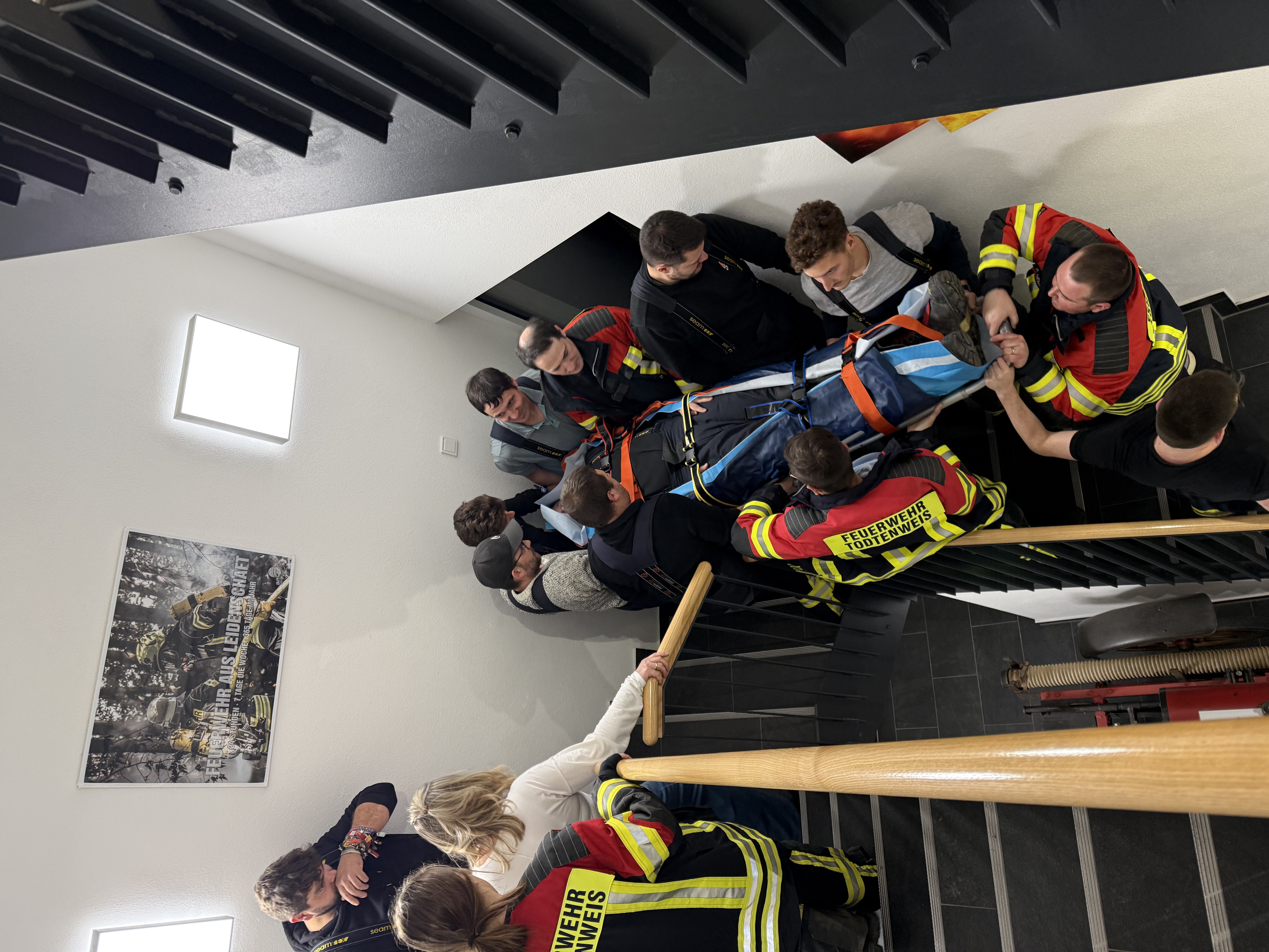 Im Anschluss an den theoretischen Teil wurde das Gelernte in einer praxisnahen Übung angewendet. Die Feuerwehrkräfte trainierten verschiedene Szenarien, wie sie im Einsatzalltag häufig vorkommen: das schonende Umlagern einer verletzten Person, das gemeinsame Tragen über enge Treppenhäuser sowie das sichere Arbeiten in unwegsamem Gelände. Dabei konnten alle Teilnehmenden wertvolle Erfahrungen sammeln und Routine in der Abstimmung mit dem Rettungsdienst entwickeln.