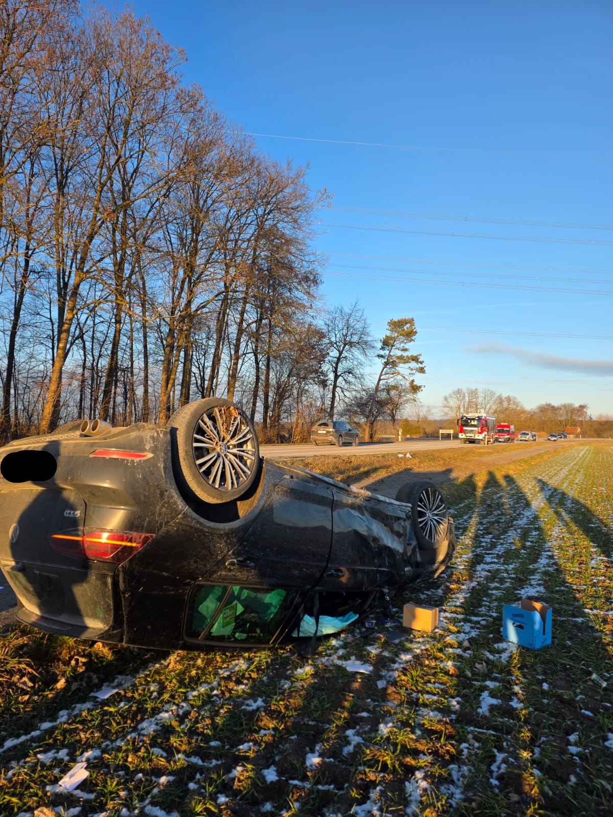 Ein Fahrzeug hatte sich dabei überschlagen und war auf dem Dach liegen geblieben. Die Fahrerin konnte sich glücklicherweise selbst aus dem Fahrzeug befreien. Beim Einteffen der Feuerwehr wurde sie bereits durch einen zufällig vorbei fahrenden Rettungswagen versorgt.