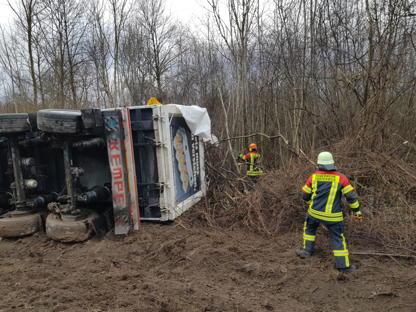 Ein mit Pellets beladener LKW kam aufgrund der winterlichen Verhältnisse von der Fahrbahn ab und kippte dabei um.
